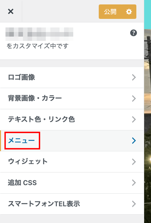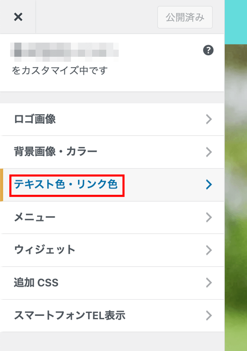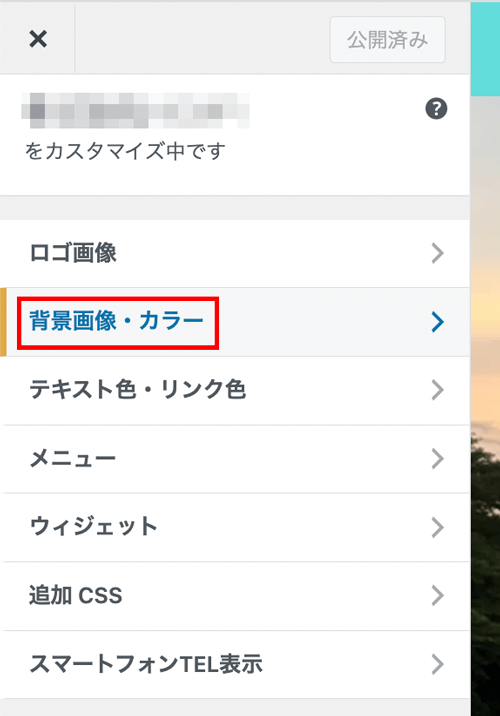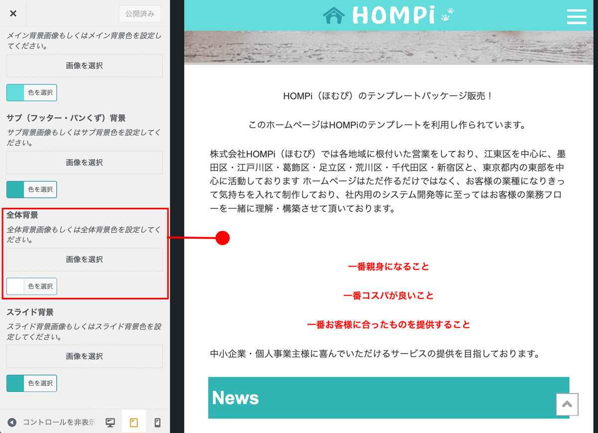 この「カスタマイズ」の画面で、サイト全体の使用色やロゴ画像、背景画像などをそれぞれ設定します。