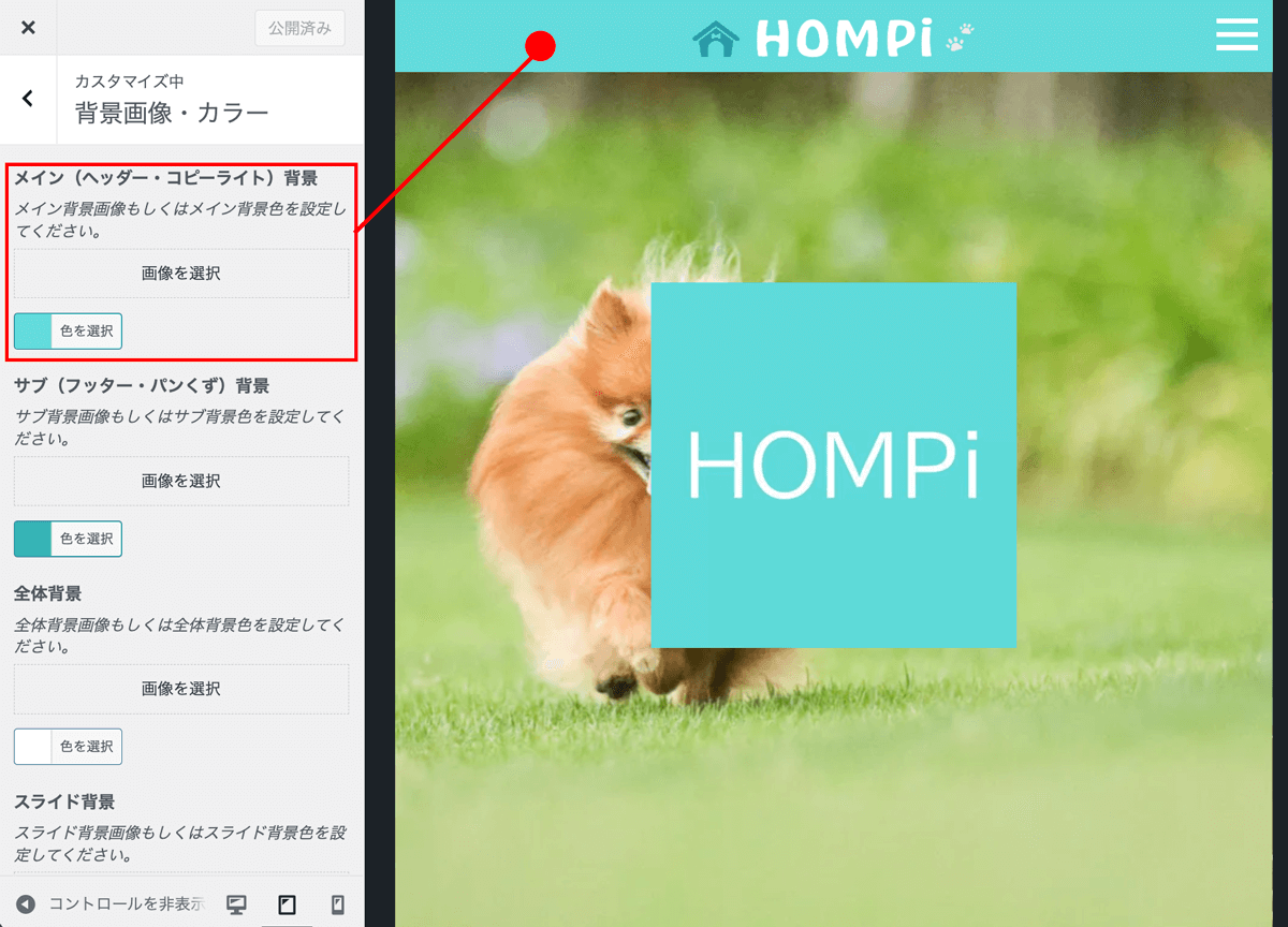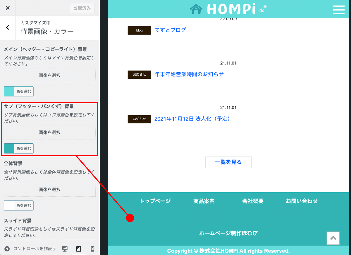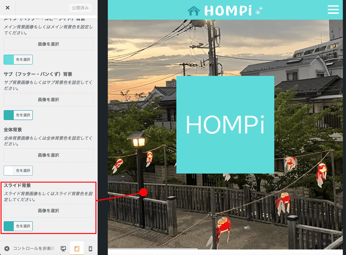 スライド画像(メインビジュアル画像)は別の項目で設定しますが、ここではスライド部分(メインビジュアル部分)に使用する背景色を指定できます。