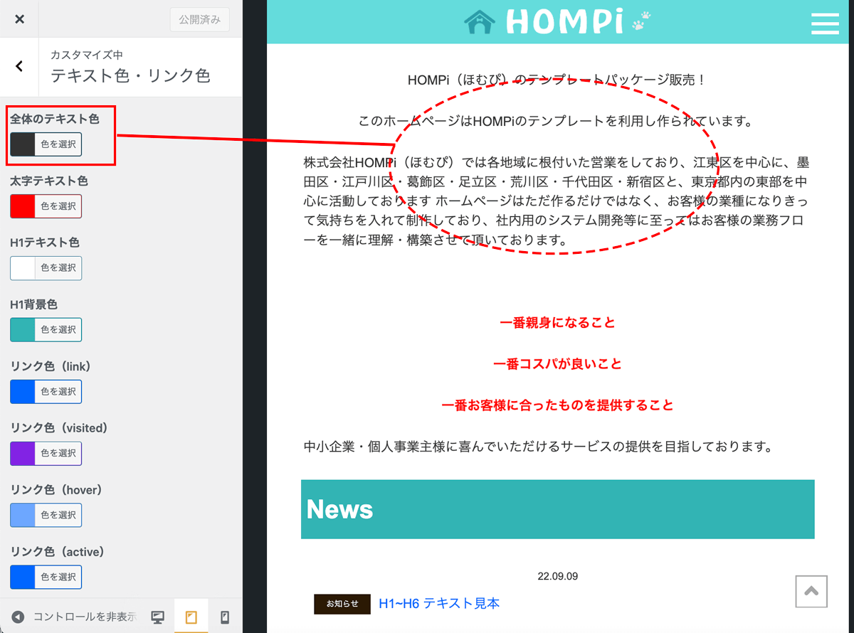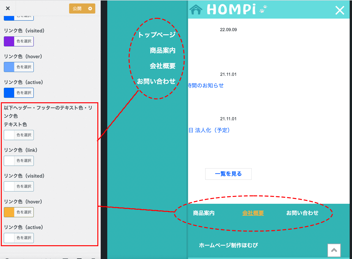 ヘッダーやフッターのリンク色も指定できますので、こちらも同様に設定してください。