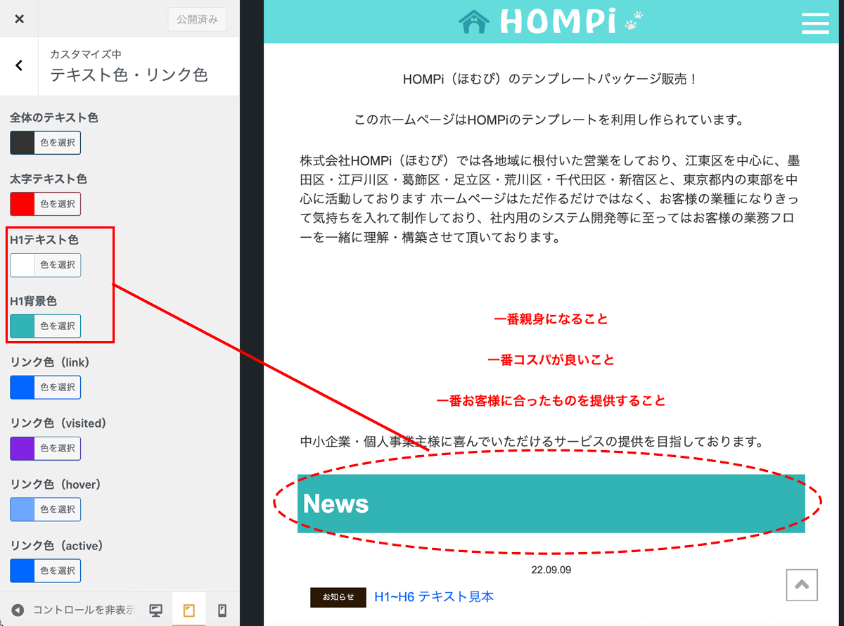 H1の大見出しに使用されるテキスト色と背景色を指定できます