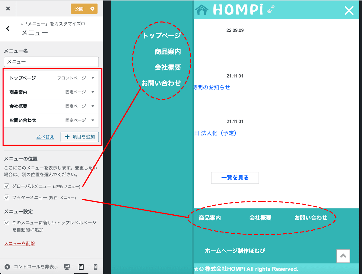 グローバルメニューとフッターメニューのチェックボックスをON/OFFすることで、表示する/しないを選択できます。