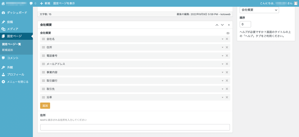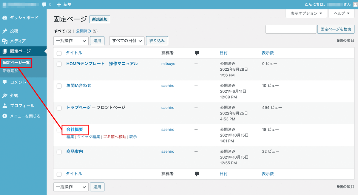 会社概要ページの内容は、「固定ページ一覧」内にある「会社概要」の詳細画面で編集できます。
