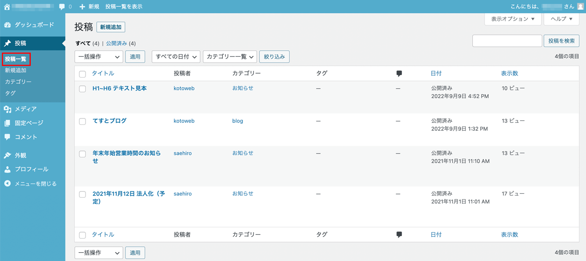 News欄に表示される内容は、「投稿」の画面で新規登録や編集ができます。