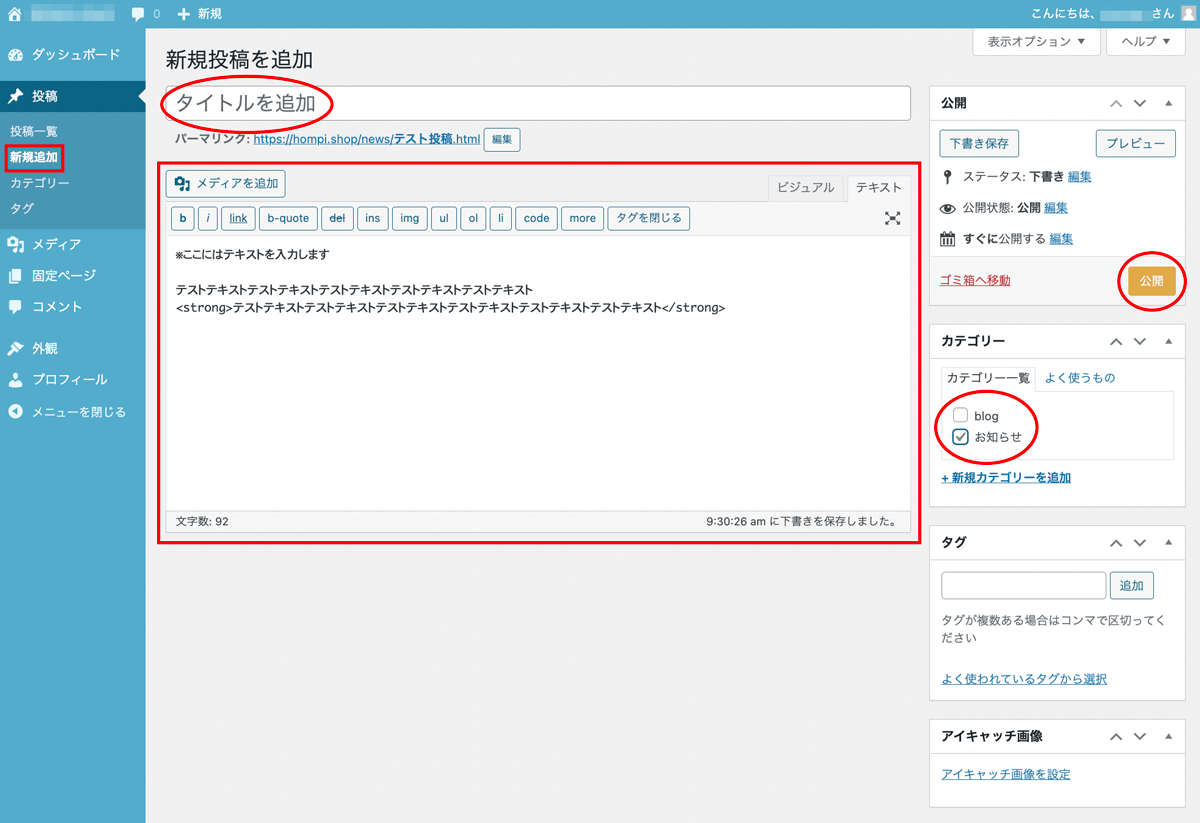 固定ページの「新規追加」画面にて内容を入力し、「公開」ボタンを押下して登録を終了してください。