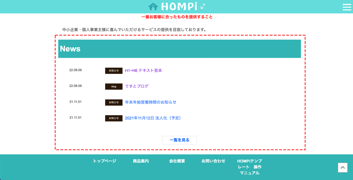 「News」欄自体を非表示としたい場合は、固定ページ一覧にある「トップページ」の詳細画面の下記チェックをOFFにすると、非表示とすることができます。
