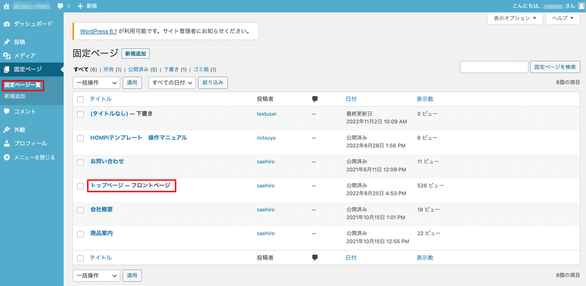 トップページに表示されるスライド画像を設定する場合は、固定ページ一覧の中にある「トップページ」の詳細を開いてください。