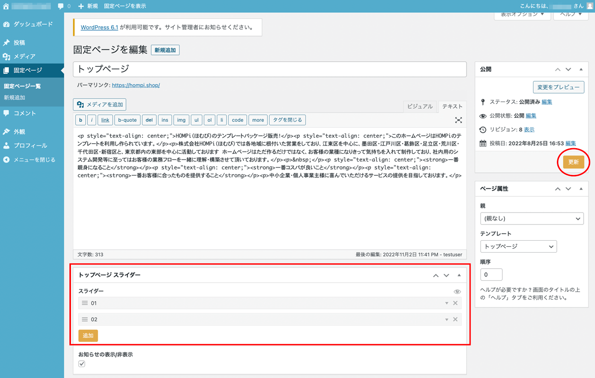 全て入力したあとは、「更新」ボタンを押下して編集を終了してください。